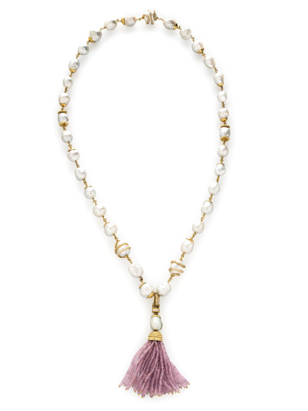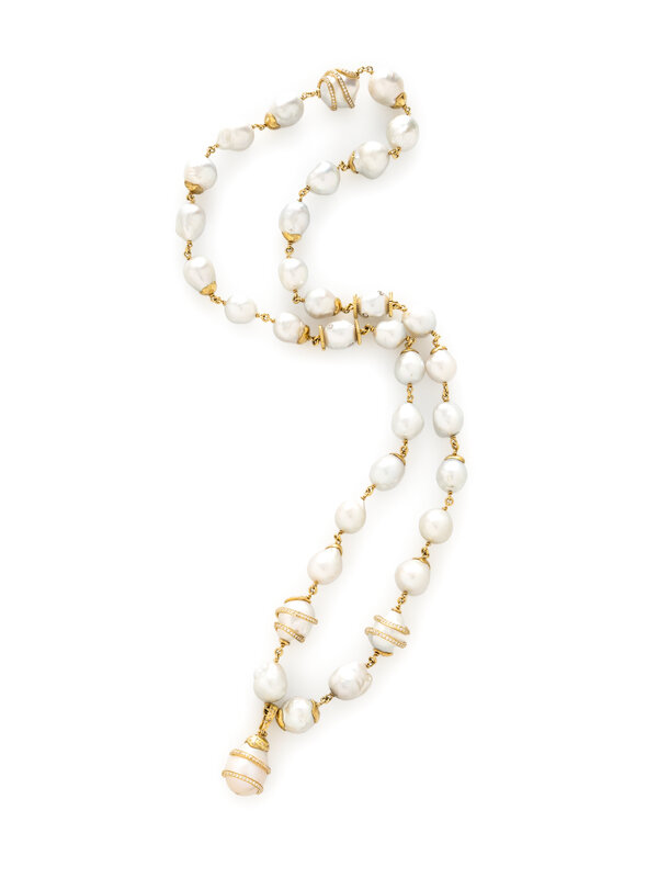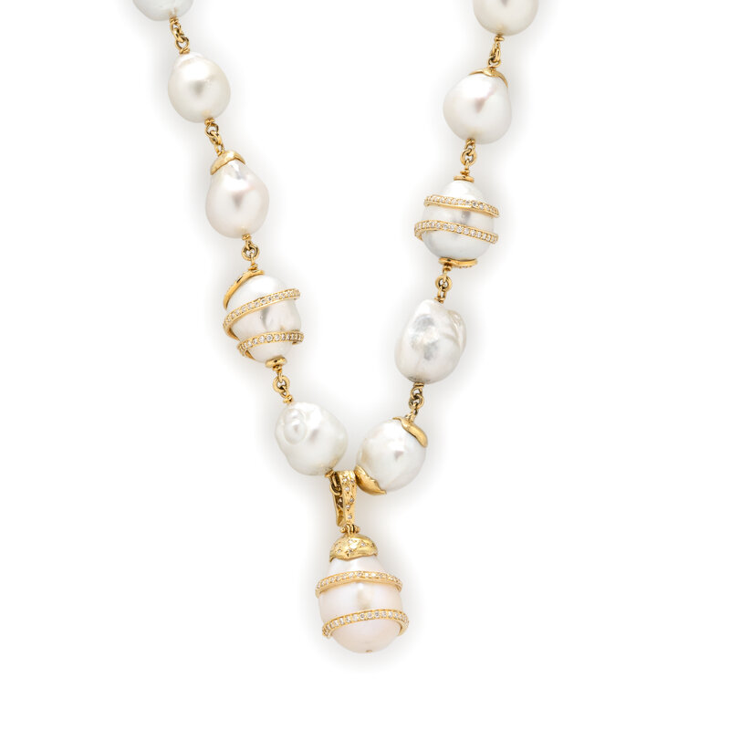 A convertible necklace set with cultured baroque pearls measuring approximately 14.00 - 19.00 mm and round diamonds weighing approximately 2.35 carats total, which may be split into two shorter necklaces, with two detachable pendants, the first set with a cultured baroque pearl measuring approximately 25.50 x 18.50 mm and round diamonds weighing approximately 0.75 carat total, the second set with a cultured baroque pearl measuring approximately 16.75 x 15.00 mm, round diamonds weighing approximately 0.50 carat total, and 25 strands of faceted pink sapphire beads. Mounted in 18 karat yellow gold. Necklaces: 16 3/4 inches long and 19 inches long. Pendants: 1 3/4 inches long and 4 3/4 inches long.
