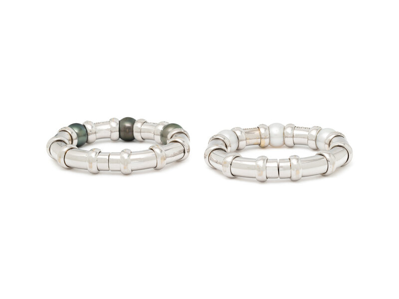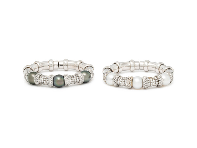 A pair of semi-flexible cuff bracelets, one set with grey cultured pearls and one set with white cultured pearls, the pearls measuring approximately 11.25 - 11.50 mm, and both set with round diamonds weighing approximately 6.00 carats total. Mounted in white gold. 5 - 5 1/8 inches inner circumference.