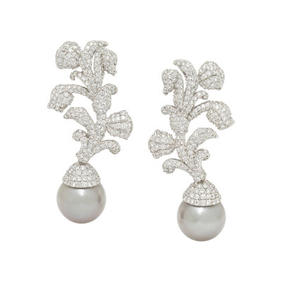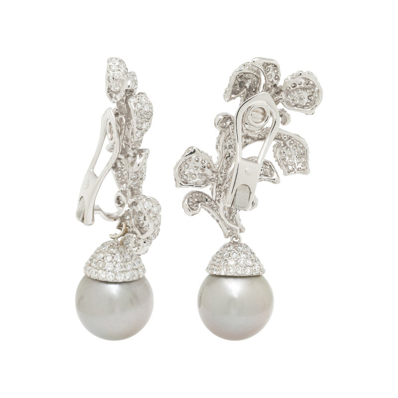 In a foliate design, the earrings pavé-set with round diamonds weighing approximately 5.00 carats total, suspending removable drops set with cultured gray pearls (origin of color not tested) measuring approximately 15.20 mm, and round diamonds weighing approximately 1.75 carats total. Mounted in 18 karat white gold. Earrings: 1 1/2 inches long. Drops: 3/4 inch long.