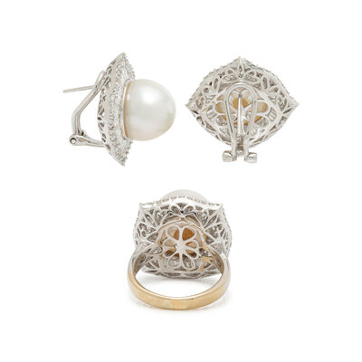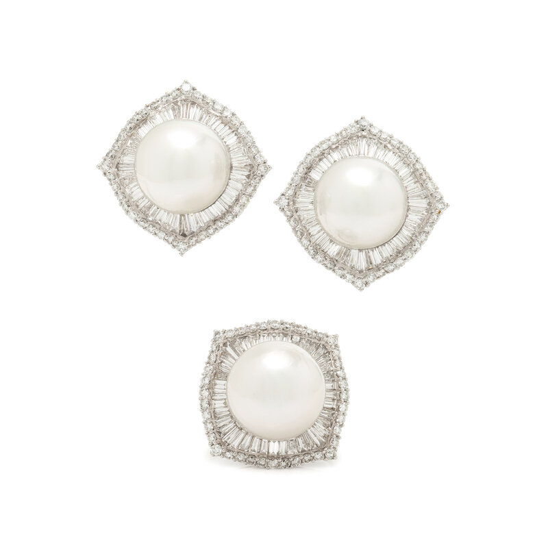 Including a ring and a pair of stud earrings, set with cultured pearls measuring approximately 12.85 - 13.75 mm, surrounded by haloes of round and tapered baguette cut diamonds weighing approximately 4.50 carats total. Mounted in 18 karat white gold. Ring size 8 1/4. Earrings: 3/4 inch long.