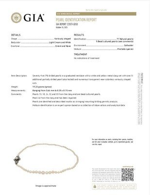 GIA, 2025, Report No. 2235745353, 71 Natural Pearls, 5 Bead Cultured Pearls, Saltwater, Pinctada Species, No indications of treatment