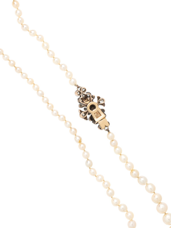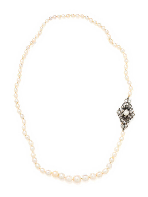 A single strand of graduating natural pearls measuring 3.66 - 8.15 mm, and 5 cultured pearls, with a silver-topped gold clasp set with old mine and rose cut diamonds and a natural pearl. 17 1/2 inches long.