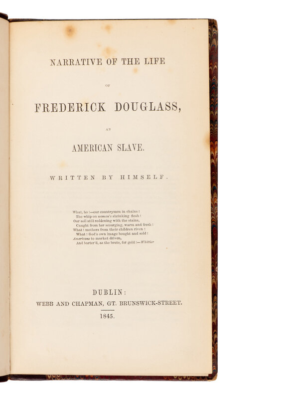 First Dublin edition and the first to be published outside of the United States. First published in Boston in the summer of 1845, this Dublin edition was published to coincide with Douglass's anti-slavery tour of Great Britain and Ireland. A note by the Committee of the Hibernian Anti-Slavery Society is printed on the verso of the title-page.