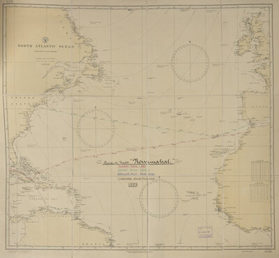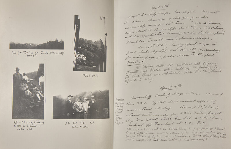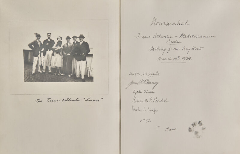 The facsimile logbook comprises over 100 entries (in the various hands of the voyage's party), and recounts the trans-Atlantic and trans-Mediterranean voyages taken by the Nourmahal, from March 18-June 25, 1929, and includes accounts of the weather and sea conditions, as well as details of the travelers daily activities and escapades. The travelers included Vincent Astor and his wife, Helen, as well as Countess Edith Mortimer di Zoppola, James H. Barney, Lytle Hull, Charles D. Draper, and Kenneth P. Budd (others, including, but not limited to, Harriette Wilson and Ethel Russell, joined at later stages of the journey). They departed from Key West, making stops in Havana, Madeira, Casablanca, Tangier, Seville, Majorca, Barcelona, Monaco, Corsica, Naples, Palermo, Venice, Spalato, Athens, Istanbul, etc., before returning via Sandy Hook, New Jersey.