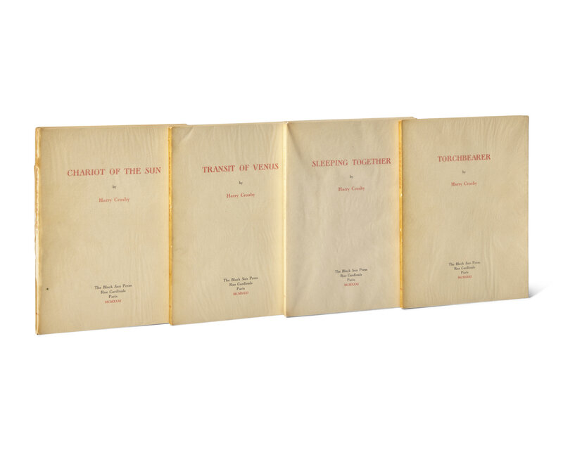 Paris: The Black Sun Press, 1931. In four volumes, comprising: Chariot of the Sun (Vol. I); Transit of Venus (Vol. II); Sleeping Together (Vol. III); Torchbearer (Vol. IV). Each numbered 27, with the exception of Sleeping Together (#25), of possibly 500 sets on Navarre paper (watermarked "Papeteries Lafuma"). 8vo. Title-pages printed in red and in black. Illustrated with one frontispiece and one plate. Publisher's stiff printed wrappers; in original glassines, spines browned, scattered wear, some loss along spine of Chariot of the Sun; presumably lacking slip case. Minkoff A-42; Roberts, Lawrence B33 (Chariot of the Sun); Gallup, Eliot B18 (Transit of Venus); Gallup, Pound B25 (Torchbearer)