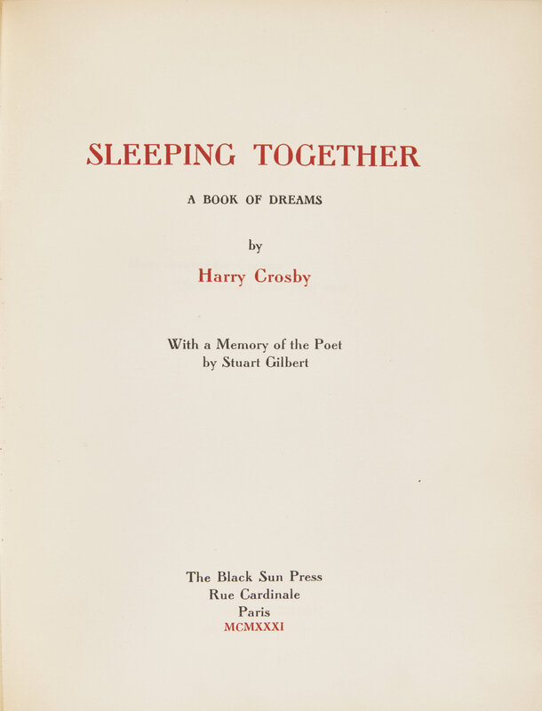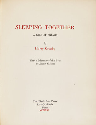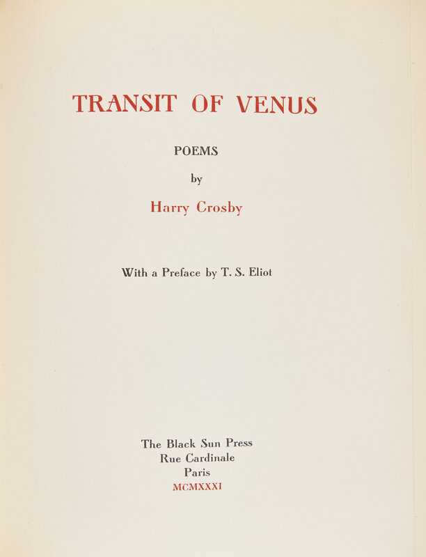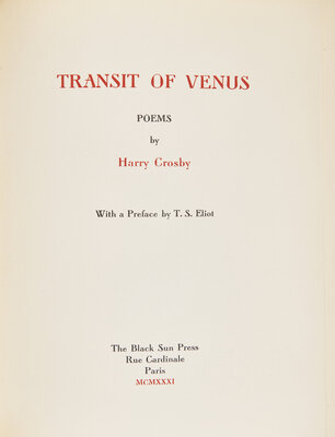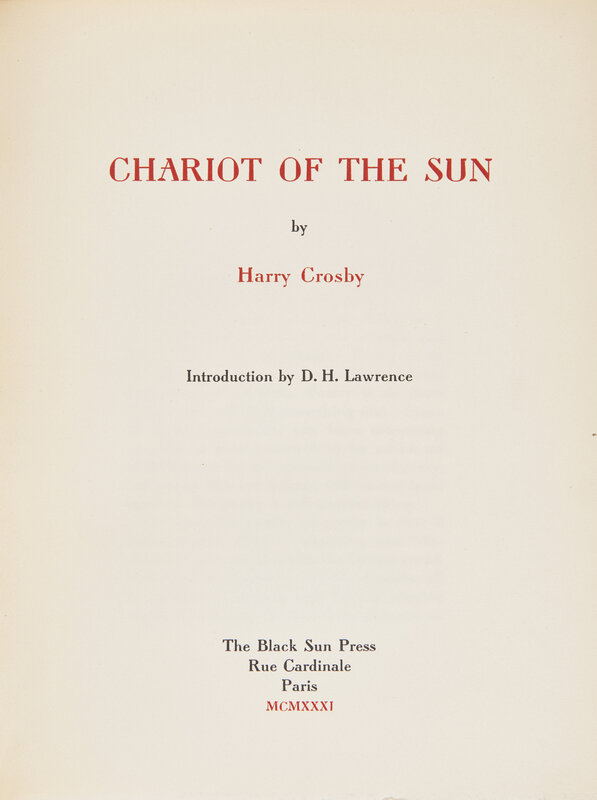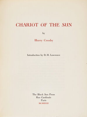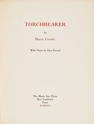 Caresse Crosby's memorial to her late husband, Harry Crosby, published a year following his death in 1930. Caresse edited Harry's poems for this publication, comprised of three volumes that had previously been published (Chariot of the Sun, in 1927; Transit of Venus, in 1928; Sleeping Together, in 1929), with a forth volume of unpublished work gathered as Torchbearer. D.H. Lawrence provided an introduction for Chariot of the Sun, that was omitted from the first edition, while T.S. Eliot, Stuart Gilbert, and Ezra Pound were commissioned to provide commentaries for the other three volumes.