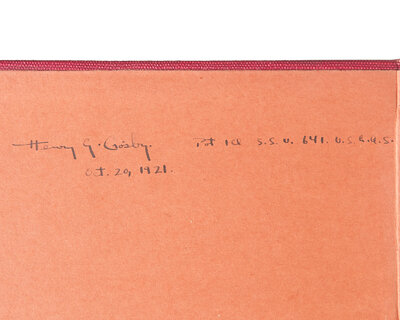 Black Sun Press co-founder Harry Crosby's copy of this comprehensive pictorial record of World War I. At 19 years old, Crosby volunteered to serve in the American Ambulance Service, arriving in France in July 1917. Following the United States's entrance to the war, he enlisted in the U.S. Army and was attached to the 120th French Division. He saw action at the Front during the Second Battle of Verdun, and barely escaped death when a mortar shell hit his ambulance, vaporizing it but leaving him miraculously unscathed. This near-death experience had a profound effect on him, causing a spiritual awakening and obsession with death and waste that would continue throughout his life, causing him to annually celebrate his "death day". Crosby described this moment in a letter to his mother ten years later, "Ten years ago today on the hills of Verdun and the red sun setting back of the hills and the River Meuse and the black shells spouting up in columns and the roar of the barrage and Spud was wounded and the ride down and the metamorphose from boy into man on November 22, 1917 I shall never never forget..." (Wolff, Black Sun, p. 53). Crosby continued to work on the Front for the remainder of the war, and was awarded the Croix de Guerre for his heroics at the Battle of the Orme, where he and his section, working day and night, carried over 2,000 wounded soldiers off the battlefield. At war's end he returned home a hero, but alienated. He subsequently enrolled at Harvard, and graduated in 1921, the year he inscribed this book.