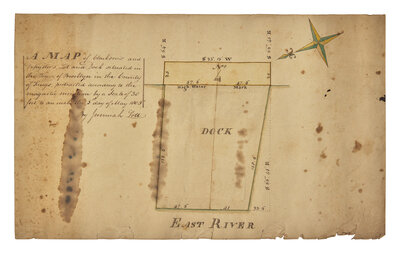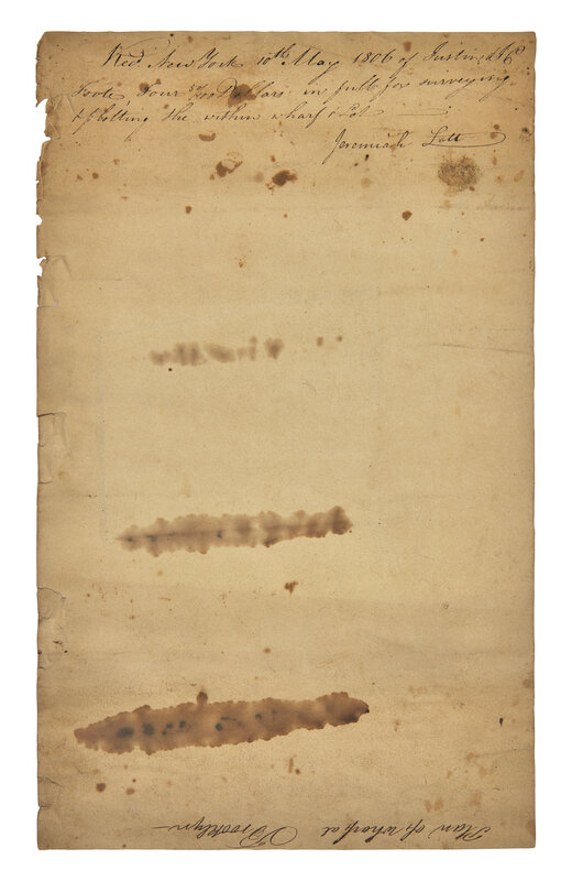 (Brooklyn, New York), May 5, 1806. One sheet, 8 x 13 1/2 in. (203 x 343 mm). Hand-colored manuscript lot map drawn and signed by Jeremiah Lott, captioned "A Map of Clarkson's and Depeyster's Lot and Dock situated in the Town of Brooklyn in the County of Kings, protracted according to the magnetic meridian by a Scale of 30 feet to an inch the 5th day of May 1806." Manuscript compass rose at top right. Docketing on verso "Recd. New York 10th May 1806 of Justin & J.C. Foote Four 50/100 Dollars in full for surveying & plotting the within wharf & lot - Jeremiah Lott." Also docketed on verso with title "Plan of Wharf at Brooklyn." Creasing from old folds, two large dampstains affecting text and map, bottom margin worn with some loss; scattered foxing.
