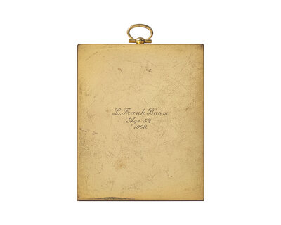 No place, 1908. Watercolor. Approximately 5 x 4 in. (127 x 102 mm). Signed in bottom right by Claude E. Quivey ("Quivey"). In gilt metal presentation case, engraved on verso, "L. Frank Baum / Age 52 / 1908."; 5 1/4 x 4 1/4 x 3/8 in. (133 x 108 x 9 mm). In quarter brown morocco and velvet-lined solander box.