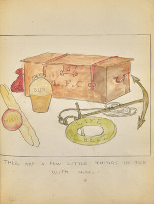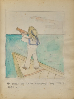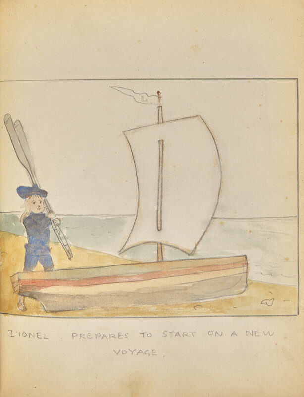 A fine and very charming original manuscript for an unpublished children's book by English illustrator Walter Crane, made for his five-year-old son Lionel Crane's (1876-1943) personal enjoyment. The story features 60 full-page illustrations and follows a young boy (also named Lionel) on his many seafaring adventures. First, Lionel travels to the Straits of Knowledge, where he battles against the Kings of Reading, Writing, and Arithmetic, and is saved by the H.M.S. Perseverance. After a short stop to the large city of Knowledge, where Lionel is welcomed with fireworks and celebrations, he takes back to the sea where he encounters islands made of stewed pears and of jelly, all the while meeting various peoples and creatures, including a large menacing whale, and the King of Jelly Fishes. At the end, Lionel's boat is sunk by King Storm and his horde of Storm Trumpeters, but is saved by a ship and returned to port, where he will no doubt shortly take to the sea once again.