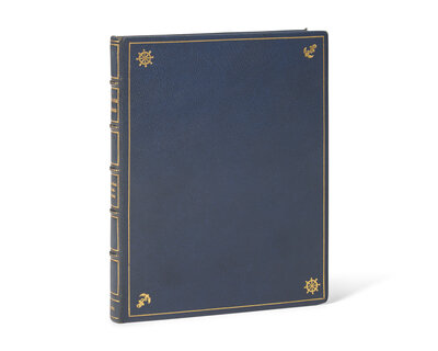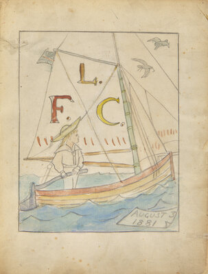 No place, August 3, 1881. Original illustrated manuscript, comprising 60 leaves, each with a full-page graphite and watercolor drawing, and with manuscript caption below each image; on rectos only; first page titled "L.F.C." in colored block letters (Lionel Francis Crane, the author's son). 8vo (7 3/4 x 6 1/4 in.; 197 x 159 mm). Full navy blue morocco, stamped in gilt, with gilt nautical ornaments in each corner of front and rear boards; marbled endpapers; by Bennett, New York; one sheet loose; scattered spotting.