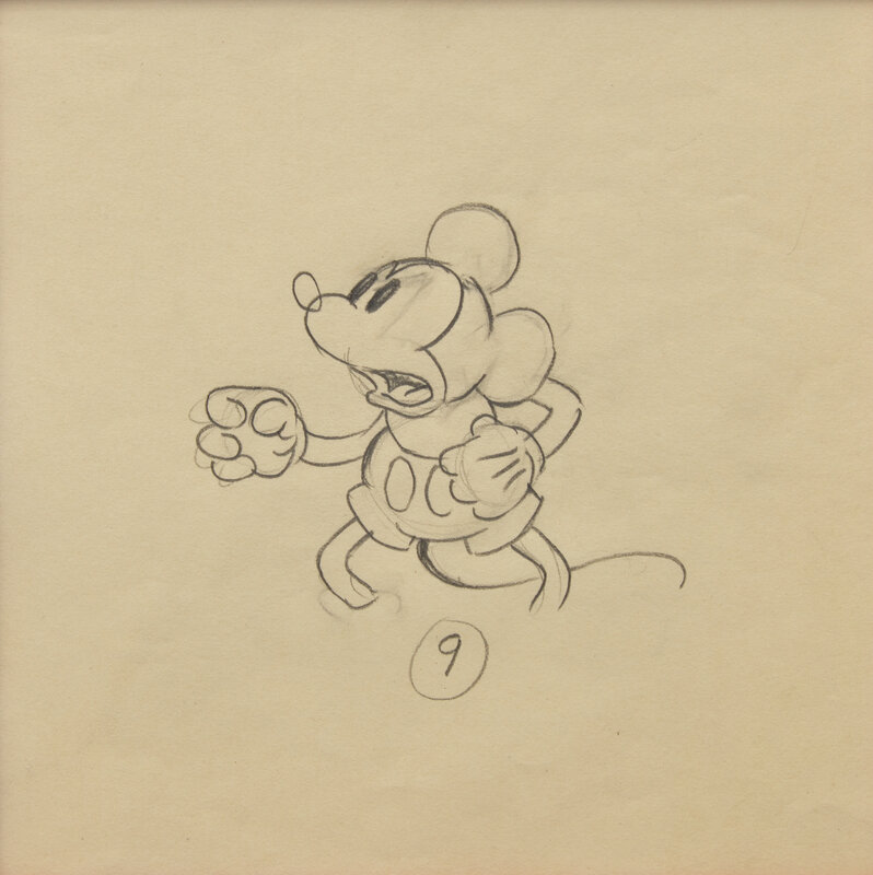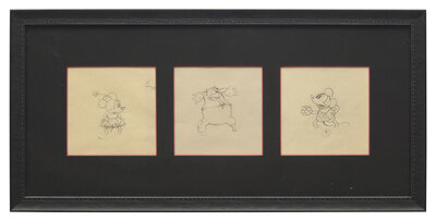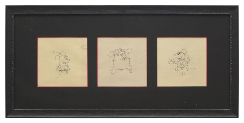 (Burbank, California: Walt Disney Productions, ca. 1933). Pencil on three sheets of paper, each numbered in pencil at bottom, recto or verso. Sheets measuring 9 1/2 in. (241 mm) tall and from 9 1/4 to 12 1/8 in. wide (235 x 308 mm); Minnie and Pete sheets folded along left and right edges; circular perforations at bottom. In mat and in frame, 13 3/4 x 28 1/4 in. (349 x 717 mm).