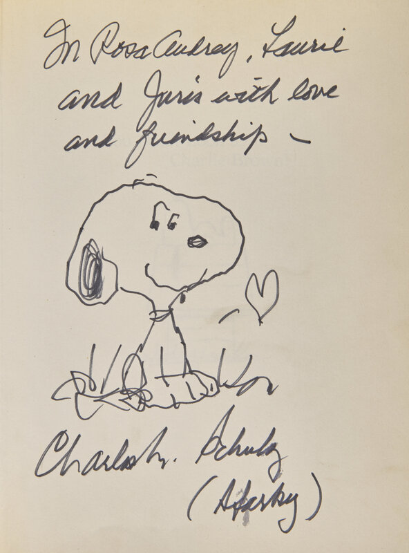 New York: Holt, Rinehart and Winston, (1985). First edition. 4to. Presentation copy, signed and inscribed by Schulz on front free endpaper, and with an original drawing of Snoopy by him: "To Rosa, Audrey, Laurie and Jurvis with love and friendship-- [Snoopy drawing] Charles M. Schulz (Sparky)". Publisher's red cloth over tan paper-covered boards, stamped in gilt; in original unclipped pictorial dust-jacket, designed by Cynthia Farah and Robert Reed; light toning to sheet margins.