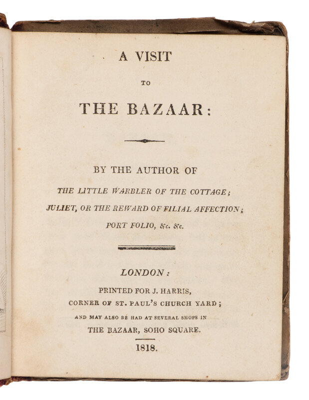A Visit to the Bazaar was published two years after the opening of John Trotter's indoor bazaar in Soho Square, London, and serves mainly as an advertisement for the merchants therein, including the "Bookseller" as the frontispiece.
