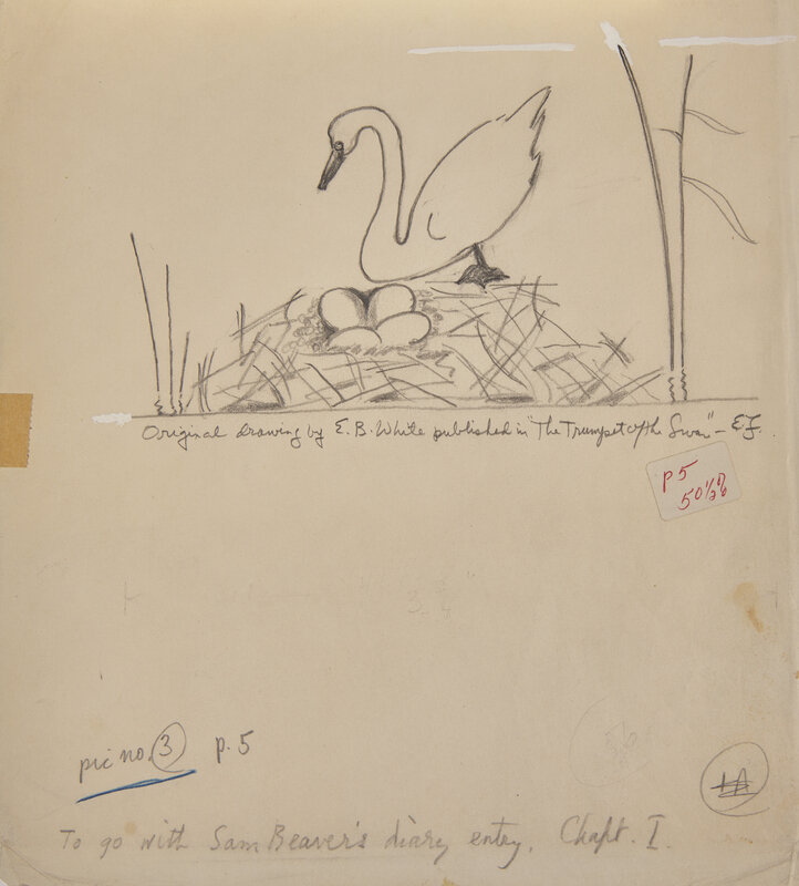 An original pencil drawing by E.B. White for his above work; on translucent paper, and attached with masking tape to the upper portion of larger wove sheet. Inscribed below image by Frascino: "Original Drawing by E.B. White published in "The Trumpet of the Swan'--EF"; pencil notations at bottom of larger sheet: "pic no. 3 p. 5 / To go with Sam Beaver's diary entry, Chapt. I." Lightly worn and soiled; small sticker underneath drawing.