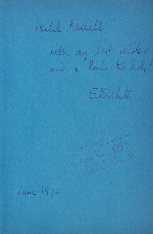 New York, etc.: Harper & Row, Publishers, (1970). First edition. Presentation copy, inscribed by White on front free endpaper: "Isabel Russell / with my best wishes / and a loud ko hoh! / EB White / June 1970". 8vo. (viii), 210, (6) pp. Illustrated by Edward Frascino. Original blue cloth, stamped in silver and in gilt; blue endpapers; gift inscription on front free endpaper, below White's inscription: "For Jeff and Jane / summer of 1996 / Isabel Russell"; in original pictorial dust-jacket, bottom of front flap clipped, light wear along extremities, ink inscription on rear flap, noting the textual error on page 201: "Page 201 3d line from bottom should read 'beep' instead of 'ko-hoh' see EBW letter to Ursula Nordstrom at Harper & Row, Sept. 2, 1970. from 'Letters of EB. White, page 605".