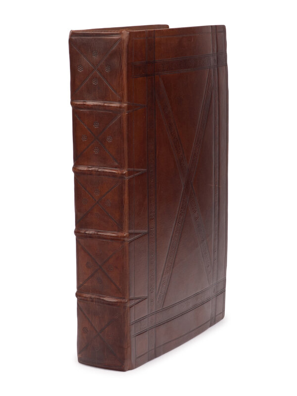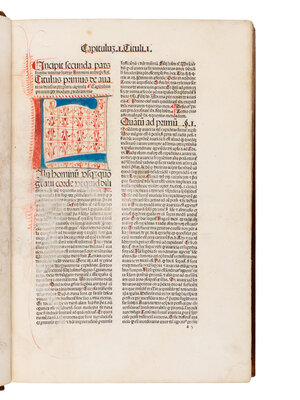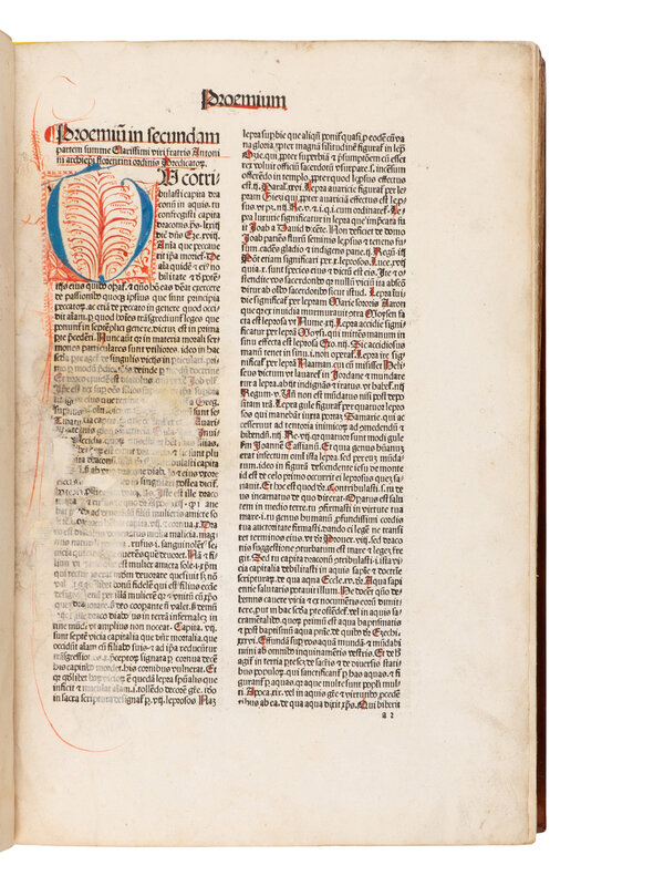 (Basel: Michael Wenssler), January 4, 1485. Part two only (of five parts). Folio. 321 (of 322) leaves; lacking a1. In 56 lines and headline; in double column. Large ornate opening penwork initial in blue and red on a2, with additional ornate penwork initial on a5; capital letters and capital strokes in red. 20th century full calf; dampstaining throughout; tissue repairs affecting inner column letters on preliminary ten leaves; very minor marginal worming to preliminary leaves; toning; some soiling. BMC III, 728; Goff A-874; GW 2188; HC 1245; ISTC ia00874000