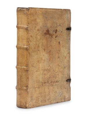 Basil: Heirs of Froben, 1542. Folio. Text in Latin in two columns; capital spaces with printed guide letters; printer's device on title page and final blank. Contemporary pigskin over wooden boards, decorated in blind, metal clasps, lacking one clasp on rear board, very minor worming, significant rubbing resulting in binding split at rear, soiling; partial loss to inner corner of front free endpaper; contemporary ownership inscriptions on title-page; some minor worming to prelims and concluding leaves; toning; soiling and spotting throughout. Adams IA, 2162; VD 16: A 4149