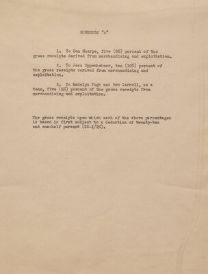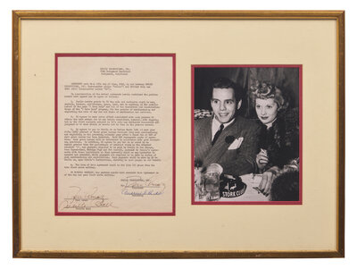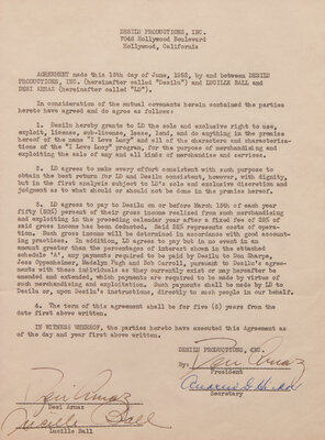 Hollywood, June 16, 1952. Single sheet, approximately 10 1/2 x 8 in. (267 x 203 mm). Typed document, signed by Lucille Ball and twice by Desi Arnaz, being a licensing contract for I Love Lucy, between Ball and Arnaz and their television production company, Desilu Productions, for the "exclusive right to use, exploit, license, sub-license, lease, lend, and do anything in the premise hereof of the name 'I Love Lucy' and all of the characters and characterizations of the 'I Love Lucy' program, for the purpose of merchandising and exploiting the sale of any and all kinds of merchandise and services."; counter-signed by Secretary Andrew G. Hickox. In mat with a portrait of Ball and Arnaz, and unexamined out of double-pane plexiglass frame, 16 1/2 x 22 in. (419 x 559 mm).