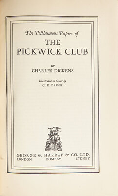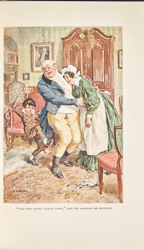 London, etc.: George G. Harrap & Co. Ltd., (1930). Tall 8vo. xx, 687 pp. Illustrated by C.E. Brock. Finely bound in full navy blue morocco, with a large pictorial panel of multi-colored morocco onlay on front board depicting Brock's illustration on p. 134 ("Take This Little Villain Away", Said the Agonised Mr Pickwick), decorated in gilt; all edges gilt; marbled endpapers; by Riviere & Son.