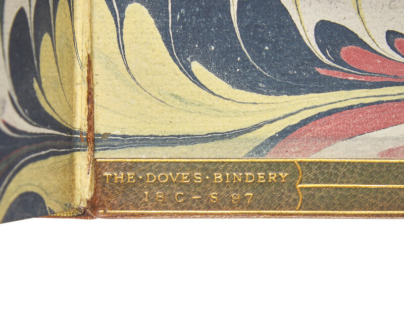 London and New York: Macmillan and Co., 1895. In three volumes. 12mo. Finely bound in full crushed green levant, decorated in gilt, spines browned, boards unevenly browned, rubbing and wear along joints of second volume, small chips at head of spines; gilt gauffered edges; gilt dentelles; marbled endpapers; by T.J. Cobden-Sanderson at The Doves Bindery (stamped on lower rear paste-downs: "The Doves Bindery / 18 C-S 97"); armorial book-plate of English legal author Francis Beaufort Palmer on front paste-down of each volume; creasing in top corner of leaves in third volume.