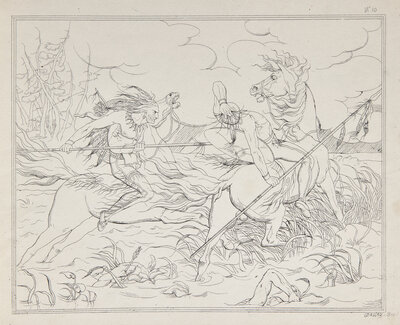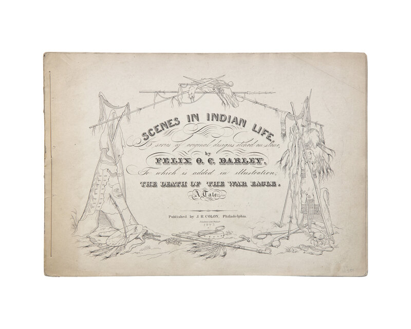 A near-complete and incredibly rare first edition of Felix O.C. Darley's first published work. Published when he was only 21 years old and a staff illustrator for his native Philadelphia Graham's Magazine. These lithographic plates, executed in sparse outline reminiscent of Bartolozzi, depict the life of a fictionalized Sioux Chief, War-Eagle. Published in only a very small quantity, it was originally issued in five parts between April-August, 1843, with each part containing three plates and accompanying text. Upon publication, Darley's friend, Edgar Allan Poe, praised them in his magazine, Saturday Museum, writing that they "abound in spirit and are in all respects meritorious."