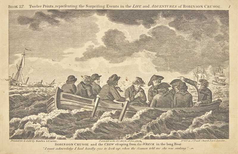 A rare and complete suite of these engravings illustrating Daniel Defoe's Life and Adventures of Robinson Crusoe. First published by Carrington Bowles in 1783, and reprinted here under partnership with Samuel Carver in 1800 (Bowles and Carver partnered in 1793).