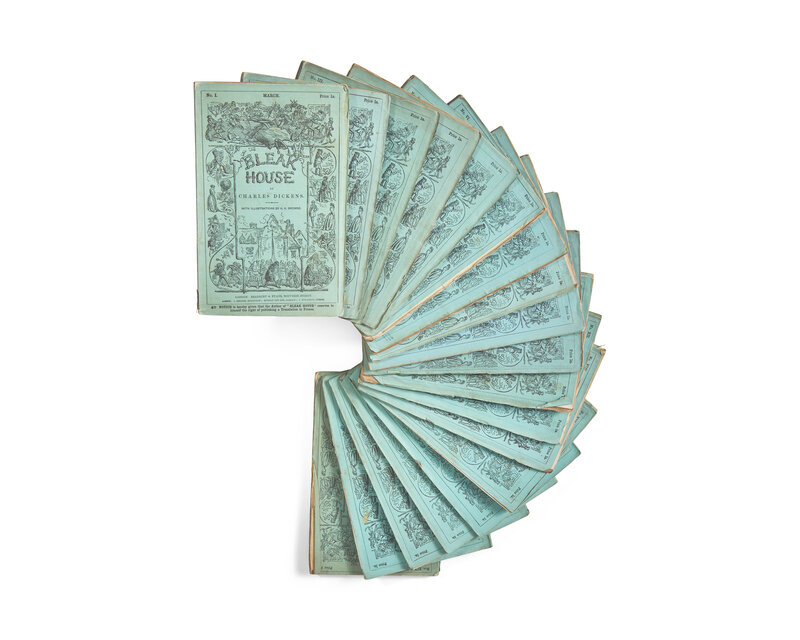 London: Bradbury and Evans, March 1852-September 1853. 20 parts in 19 volumes. First edition, in original monthly parts. 8vo. All ads and slips present per Hatton & Cleaver, except for the "Grace Aguilar's Works" ad at rear of No. XVI. With third issue of "Crochet Cotton" ad slip at rear No. III. Illustrated with an etched frontispiece, etched vignette title-page, and 38 etched plates by Hablot Knight Browne ("Phiz"), including the ten "Dark" plates. Publisher's limp printed green pictorial wrappers; bookseller's ticket at bottom front wrapper of Nos. III and IV; wrappers starting, No. IV; "Royal Library" ink stamp bottom front wrapper, No. VII; No. IX reinforced with later stab-sewn thread, with Advertiser rebound at rear; rear wrapper of Nos. X and XIX/XX detached but present; two small open tears in rear wrapper, No. XIV; wear and soiling along all wrappers, chipping and small losses along most spines. Text unopened in Nos. I and XV; prelims partially unopened in No. XIX/XX; plates darkened in Nos. III and IV, moderate to heavy foxing to other plates, generally along edges; fore-edges in Nos. XI and XVI worn and creased, some from when opened; in three-quarter brick red morocco solander box and chemises. Hatton & Cleaver, pp. 275-304; Eckel, pp. 79-81