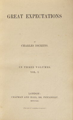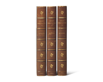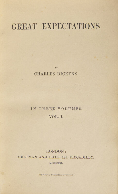 Extra-illustrated first edition, first issue in book form of Dickens's rarest work. One of only two of his works to not be illustrated and not be issued in monthly parts, it was first serialized in 36 weekly numbers in Dickens' own magazine, All the Year Round, beginning on December 1, 1860 through August 3, 1861. This book form edition was published July 6, 1861, followed by four other issues through October 30. "The rarity of the first issue of Great Expectations has been attributed to the probable small binding-up of copies with the first title-page, coupled with the fact...that 'the first edition was almost entirely taken up by the libraries'...Patten, pp. 290-92, states that 1,000 copies of the first issue and 750 of the second were printed and that probably most of the first and more than half of the second (1,400) copies in all were purchased by Mundie's Select Library." (Smith). Smith notes another copy extra-illustrated with the same Pailthorpe plates, at the Huntington Library. That copy was rebound by Riviere, and contains some corrected text.