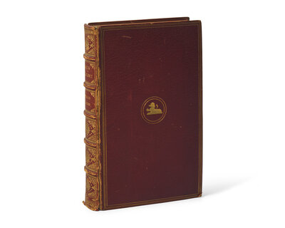 London: Chapman and Hall, 1844. First edition in book form. Thick 8vo. Illustrated with an engraved frontispiece, engraved vignette title-page, and 38 engraved plates by Hablot Knight Browne ("Phiz"). Full crimson levant, decorated in gilt, front and rear boards detached; all edges gilt; gilt dentelles; original watercolor on leather, heightened with white gouache and with pencil marks, by Helen R. Haywood, on front paste-down, reproducing the plate "Meekness of Mr. Pecksniff and His Charming Daughters" (p. 14); silk endleaves and rear doublure; by Riviere & Son. Smith II, 7