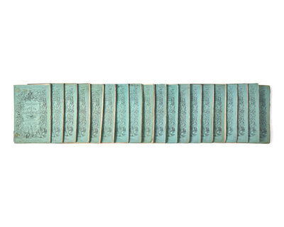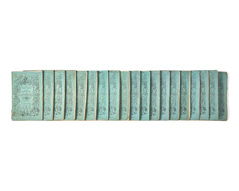 London: Bradbury and Evans, May 1849-November 1850. 20 parts in 19 volumes. First edition, in original monthly parts, first issue (with "Lile" on p. 3 of No. VIII Advertiser). Illustrated with an engraved frontispiece, engraved vignette title-page, and 38 engraved plates by Hablot Knight Browne ("Phiz"). Lacking the following ads: No. 1 lacking pp. 23-26 in Advertiser at front; rear ad in Nos. VI, VIII (rare), X, XIII; first rear ad in No. XII; lacking slip following plates in No. XVI; lacking both ads at rear of No. XVIII; lacking all four ads at rear of Nos. XIX/XX. Publisher's limp printed green pictorial wrappers, soiling and wear, scattered repairs to spines, wrappers, and extremities, contemporary ownership signatures at top of Nos. VII, VIII, XI, XIV, and XVI, Tuckerman Institute ink stamp on front wrapper of No. X; scattered spotting to text; scattered foxing to plates; text of No. XII unopened; prelims at end of Nos. XIX/XX unopened; in brown cloth fall-down-back box; by Riviere & Son. Hatton & Cleaver, pp. 253-272; Eckel, pp. 77-78