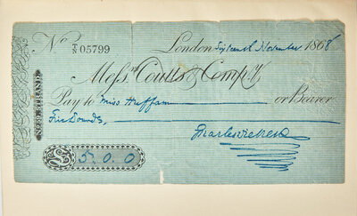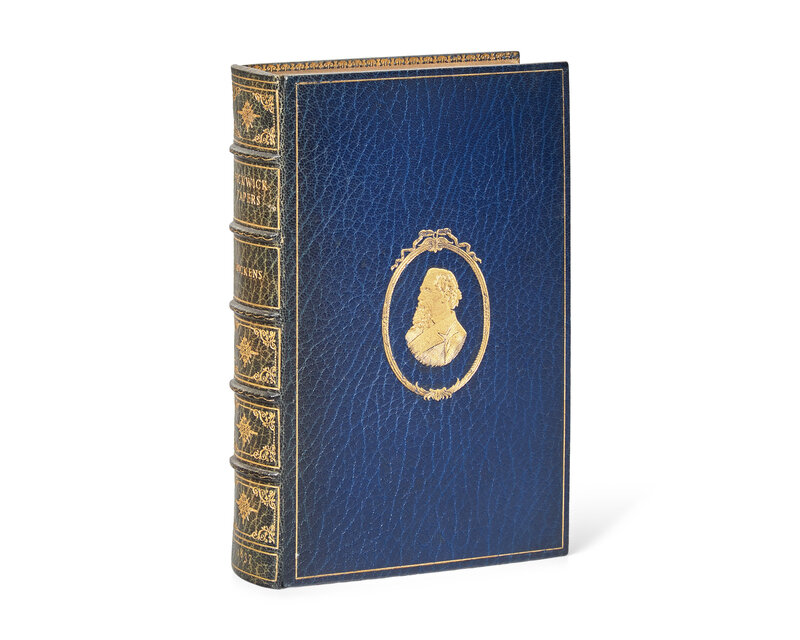 London: Chapman and Hall, 1837. First edition in book form, later issue. 8vo. xiv, (ii), 609 pp., including facsimile half-title. Original partially-printed Messrs. Coutts & Company check, accomplished and signed by Dickens mounted on front blank, dated November 16, 1868, in the amount of £5, payable to a Miss Huffam. Illustrated with an engraved frontispiece, engraved vignette title-page, and 41 engraved plates by Robert Seymour and Hablot Knight Browne ("Phiz"). Full blue levant, decorated in gilt with a circular portrait of Dickens on front board and his facsimile signature on rear board, spine slightly faded; all edges gilt; gilt dentelles; marbled endpapers; by Bayntun (Riviere); plates variously toned; top corner of final text leaf repaired; in blue cloth slip case. Smith I, 3