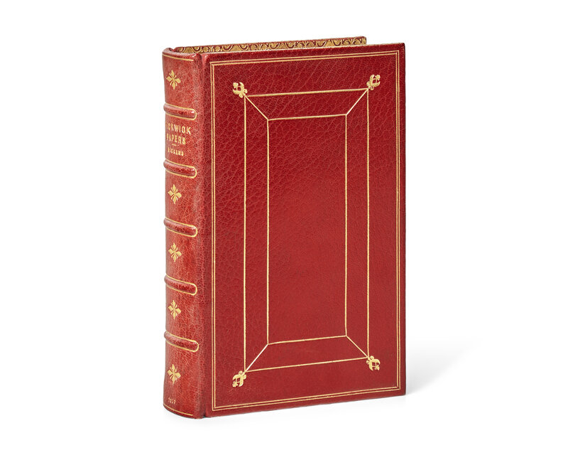 London: Chapman and Hall, 1837. First edition in book form, later issue. 8vo. Illustrated with an engraved frontispiece, engraved vignette title-page, and 41 engraved plates by Robert Seymour and Hablot Knight Browne ("Phiz"). With a fine fore-edge painting of Charles Dickens seated at his writing desk, within a decorative architectural border, and with two smaller figures representing Samuel Pickwick and Sam Weller. Full crimson levant, ruled and decorated in gilt; all edges gilt; marbled endpapers; light to moderate foxing to plates; scattered light spotting to text. Smith I, 3