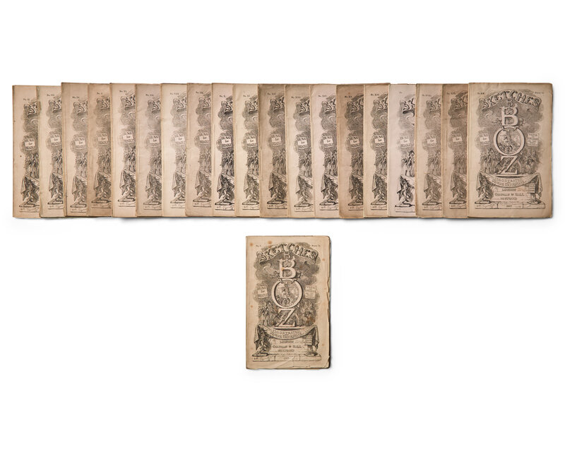 One the scarcest of Dickens' works in monthly parts. Sketches initially appeared in magazines and daily journals, with some then gathered into book form and published by John Macrone in 1836 and 1837 (see lots). In 1837, Chapman and Hall purchased the copyright from Macrone, and began publishing the work in 20 monthly parts, with the first part published in November 1837 to coincide with the release of the final monthly number of The Posthumous Papers of the Pickwick Club. The use of pink wrappers, instead of the typical green, was met with a cool reception by advertisers, contributing to the works paucity of ads. For the illustrations, George Cruikshank contributed his original 26 etchings that appeared in the book form edition--here enlarged--plus an additional 13 new designs.