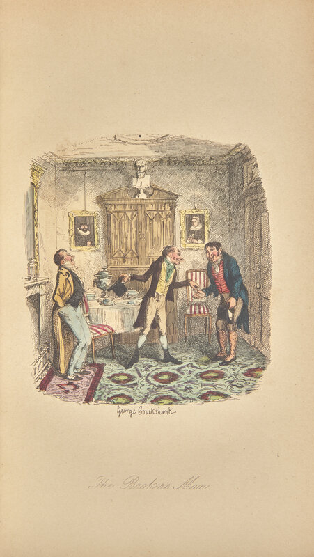 London: Chapman and Hall, 1839. New Edition, Complete (first one-volume octavo edition), early issue. 8vo. Extra-illustrated, with an etched vignette title-page and 39 etched plates by George Cruikshank (as called for), and with an additional suite of 40 hand-colored examples of the same (all uncolored plates first issue except "Greenwich Fair" and "The Last Cabdriver; all hand-colored plates later issue and without publisher's imprint), plus one hand-colored front wrapper from the monthly parts bound in at front; a note in the rear of the volume indicates that these plates were hand-colored by Dickens illustrator Frederick William Pailthorpe. Full maroon morocco, decorated in black and in gilt, rubbing to joints and extremities; all edges gilt; marbled endpapers; by Mansell; pictorial book-plate of English author Richard Adams on front paste-down, additional book-plate on same ("Blatner"); front wrapper mounted to sheet; a few plates with darkening along edges. Smith I, 2; Eckel, pp. 11-16