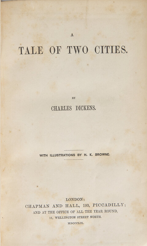 A handsome first edition in book form in the original cloth of Dickens' perennially popular work of historical fiction set during the French Revolution. Originally published in 31 weekly installments in Dickens's literary periodical, All the Year Round, from April-November 1859, and in eight monthly parts, from July-December, 1859. This book form edition was published on November 21, 1859.