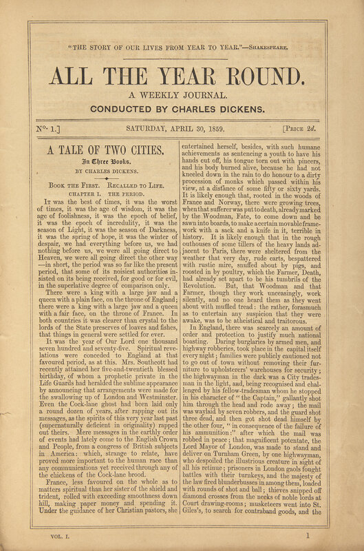The scarce first appearance of Charles Dickens's classic A Tale of Two Cities, in their original 31 weekly numbers in Dickens's magazine All the Year Round. All the Year Round was the direct successor to Dicken's previous magazine, Household Words, which ceased publication in the wake of Dickens's separation from his wife and subsequent dispute with his publishers, Bradbury and Evans. Hoping to retain readers from the previous magazine, Dickens decided to serialize his new novel, A Tale of Two Cities, beginning in the very first issue of All the Year Round, first appearing on April 30, 1859, and finishing nearly six months later, on November 5. Dickens would go on to release the novel in monthly parts from June-December, 1859, and in book form on November 21, 1859. Scarce in original wrappers.