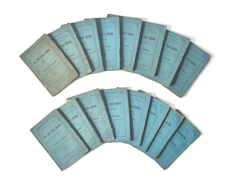 London: Chapman & Hall, December 1859-August 1860. In 10 volumes. First edition in original weekly numbers, as issued in All the Year Round (Parts 7-16, comprising Nos. 32-70). 8vo. Edited by Charles Dickens. With "Advertiser" at front and ads at rear of each volume. Publisher's printed limp blue wrappers; loss in upper left corner of Part 11; small loss in bottom edge of front wrapper of Part 14; chipping and wear along spines and extremities; scattered soiling and toning to wrappers; Part 14 lacking pp. 3-6 of front ads; pp. 439/440 in Part 16 nearly separated.
