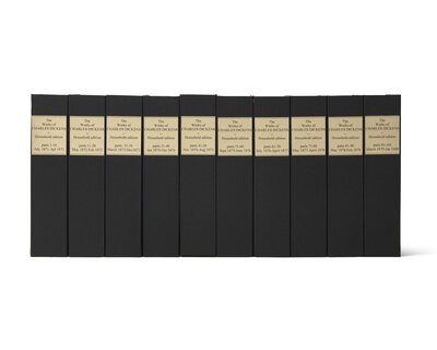 A complete set of the "Household Edition" of the works of Charles Dickens, in their 101 monthly parts and scarce original wrappers. Published beginning in July, 1871, only one year following Dickens's death, Chapman and Hall commissioned new illustrations for this edition, and included in the final volume John Forster's biography of Dickens.