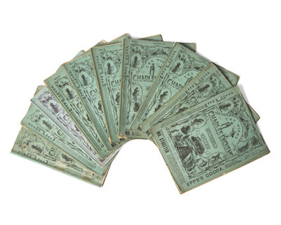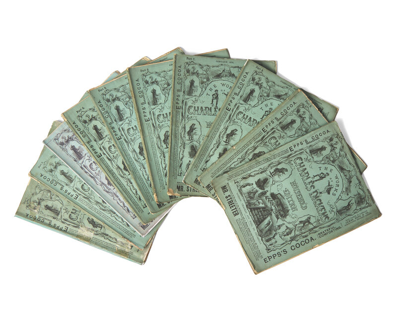 London: Chapman and Hall, July 1871-January 1880. In 101 volumes. First edition of the Household Edition, complete in the original monthly parts. Large 8vo. Ads in several volumes. Illustrated with 62 engraved plates and numerous engraved in-text plates, by J. Mahoney, F. Barnard, F.A. Fraser, C. Green, and others. Publisher's limp printed pictorial blue-green wrappers; Parts 3, 29, 31, 32, 33, 42 (remnants of rear wrapper present), and 44 in facsimile wrappers; rear wrapper of Nos. 15 and 17 in facsimile; lower portion of front wrapper of Part 30 in facsimile; loss in lower corner of rear wrapper of Part 35; rear wrapper of Part 41 separated; small loss in lower front wrapper of Part 48; other scattered repairs, losses, and wear to wrappers; some text leaves unopened; scattered soiling, creasing, and wear to text leaves and plates; in ten three-quarter black cloth fall-down-back boxes. Cook, pp. 42-44; Gimbel D66 (incomplete)