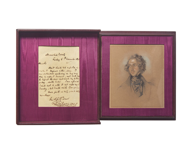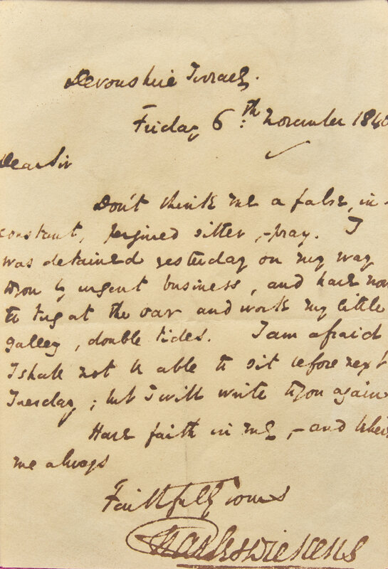 (London), Devonshire Terrace, Friday November 6, 1840. One sheet, approximately 7 1/2 x 4 1/2 in. (190 x 114 mm) (sight). One-page autograph letter, signed by Charles Dickens, presumably to Taylor: "Dear Sir Don't think me a false inconstant, perjured sitter, pray. I was detained yesterday on my way to you by urgent business, and back now to tug at the oar and work my little galley, double tides. I am afraid I shall not be able to sit before next Tuesday; but I will write you again. Have faith in me, and believe me always Faithfully yours Charles Dickens". In matching silk mat and housed in above.