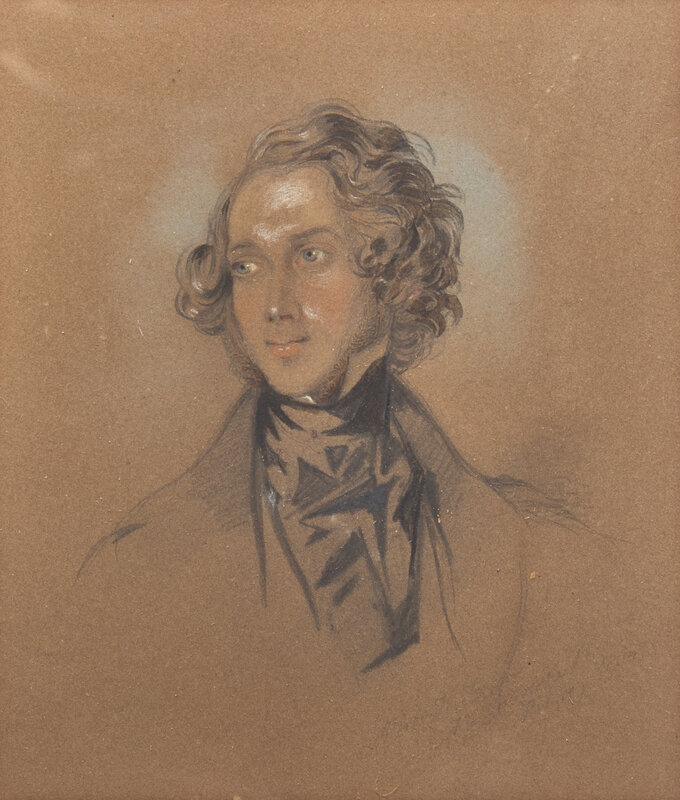 (London), ca. 1840. Pencil and wash on board, heightened with white and colored pastel. Faintly signed at bottom right by Taylor. Approximately 7 x 6 in. (178 x 152 mm) (sight). Mat burn along edges. In moire silk mat and full burgundy levant solander box.