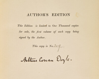 A handsome signed and limited set of Sir Arthur Conan Doyle's collected works, including: The White Company; Micah Clarke; The Refugees; Rodney Stone; Adventures of Sherlock Holmes; The Memoirs of Sherlock Holmes; A Study in Scarlet and the Sign of Four; The Great Shadow and Uncle Bernac; A Duet, with an Occasional Chorus; Tragedy of the Korosko and the Green Flag; The Stark Munro Letters and Round the Red Lamp; and The Exploits of Brigadier Gerard".
