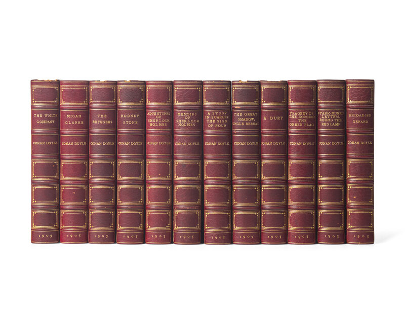 London: Smith, Elder & Co., 1903. In 12 volumes. Author's Edition (First American edition-English issue), #309/1,000 numbered sets signed by Sir Arthur Conan Doyle. 8vo. Illustrated with photogravure frontispieces and plates. Three-quarter crushed dark red morocco over red linen-covered boards, stamped in gilt, joints and extremities variously rubbed, scattered small chipping to spine ends, scattered soiling to boards, some corners worn or bumped, front board of The White Company unevenly faded; top edges gilt, other edges trimmed; scattered light spotting to text. Green & Gibson A60