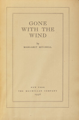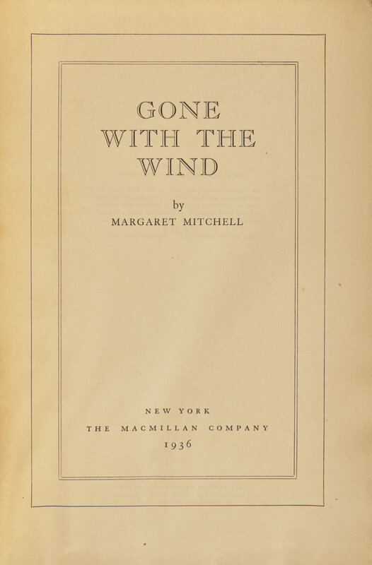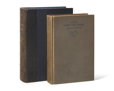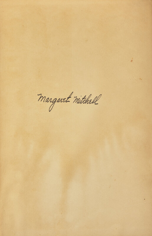 New York: The Macmillan Company, 1936. First edition, first issue (with "Published May, 1936" on copyright page). Signed by the author on front free endpaper ("Margaret Mitchell"). Thick 8vo. (vi), 1,037 pp. Publisher's gray cloth, stamped in blue, spine darkened, scattered soiling and rubbing to boards, light wear at spine ends; light wrinkling to prelims from damp; dust-jacket wanting; in quarter morocco solander box.