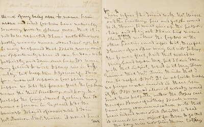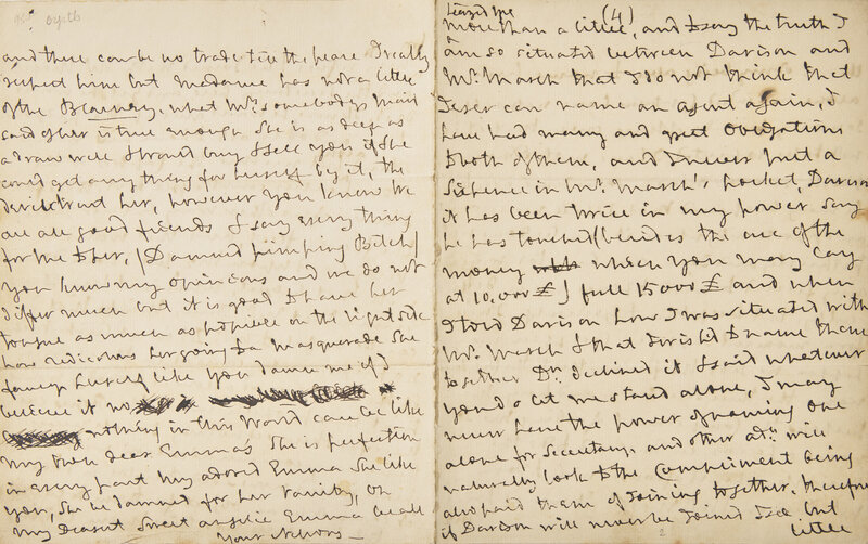 British Naval Commander Lord Nelson (1758-1805) writes to his lover, Emma, Lady Hamilton (1765-1815), likely penned while stationed in the Mediterranean Sea, off of Toulon, France, where Nelson served as commander-in-chief of the British fleet in the Mediterranean Sea that enforced a blockade on France during the French Revolutionary Wars. Here, Nelson discusses with Emma business relations with his two prize agents Alexander Davison (1750-1829) and William Marsh (1755-1846). Davison was a close and confidential friend of Nelson's, and was appointed by Nelson to be his prize agent following the Battle of the Nile (1798). Marsh was a London-based banker and businessman that fulfilled contracts with the Royal Navy, and became a prize agent that managed Lord Nelson's finances. The end of the letter sees Nelson pen explosive remarks against a Mrs. Denis, a singer and family friend of Emma's.
