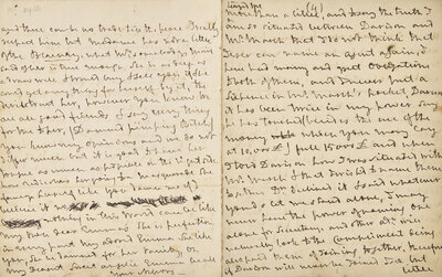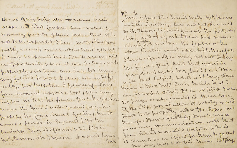 "teazed me more than a little, and to say the truth I am so situated between [Alexander] Davison and Mr. [William] Marsh that I do not think that I ever can name an agent again. I have had many and great obligations to both of them, and I never put a Sixpence in Mr. Marsh's pocket, Davison it has been twice in my power say he has touched (besides the use of the money which you may lay at 10,000 £) full 15000 £ and when I told Davison how I was situated with Mr. Marsh & that I wished to name them together D[aviso]n. declined it & said whatever you do let me stand alone, I may never have the power of naming one alone for Secretary, and other Ad[mira]ls. will naturally look to the compliment being also paid them of joining together, therefore if Davison will never be joined I see but little chance of my being able to name him alone and indeed Captains have naturally so many friends of their own that it is not to be expected I have wrote Davison pretty near as much as some time ago, but he may be assured that I shall never omit an opportunity when it can be done with propriety and I am sure he is too much my friend to wish to place me in difficulty, but keep this to yourself--I will for a moment suppose a case which may happen we take the french fleet the Captains name the three Secretarys (sic) and pay me perhaps the compliment of asking me to name a person in England to do the business I should of course wish to join Mr. Davison & Mr. Marsh it would hurt me for him to refuse to be joined with Mr. Marsh and the Secretary here and yet he would do it. I know he would give up the proposition and only ask to have his name stand alone but neither the captors or the other parties could agree to it, therefore I know of no other way but not taking the french fleet, and that would be very hard upon me but I have done with that subject. What is it my dear Emma that Mr. Denis thinks that I can be useful to Mr. D[eni]s. in at Civita Vecchia no prizes can be carried in there even if the Pope would allow it nobody would trust their property under the Popes (sic) care therefore I know of nothing I shall never have any communication with that place indeed now Lord Bristol is dead it cannot be an object for them to go out the pay will not hire their lodgings and there can be no trade till the peace I really respect him but Madame has not a little of the Blarney, what Mr. somebodys (sic) maid said of her is true enough She is as deep as a draw well & would buy & sell you if she could get any thing for herself by it, the Devil directs her, however you know we are all good friends & say every thing for me to her, (Damned pimping Bitch) you know my opinions and we do not differ much but it is good to have her tongue as much as possible on the right side how ridiculous her going to a masquerade she fancys (sic) herself like you damn me if I believe it no nothing in this World can be like my own dear Emma's She is perfection in every part my adored Emma She like you, She be damned for her vanity, Oh my dearest sweet angelic Emma be all Your Nelson--"