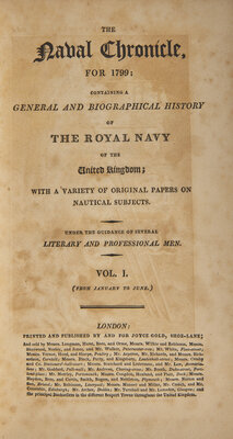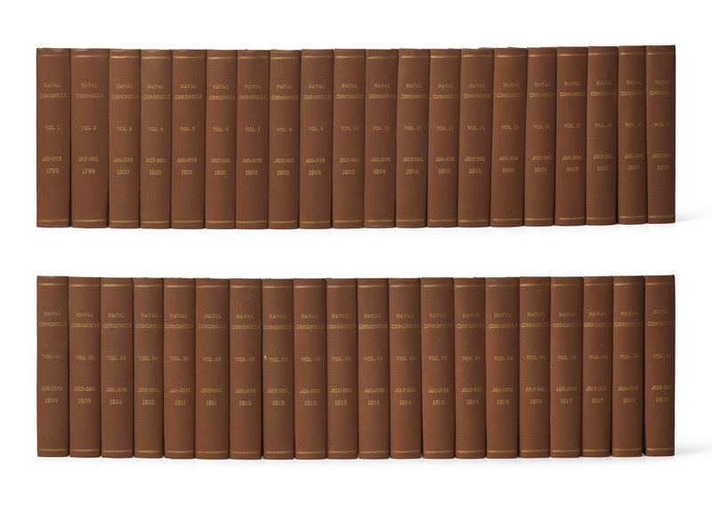 A rare and complete set of this naval history periodical. The Naval Chronicle was a monthly magazine published in London in parts from January 1799 to 1818, during the period from the Napoleonic Wars through to and including the War of 1812. Each issue featured an extensive number of reports of naval battles, including lists of captured and wrecked vessels; news of promotions, retirements and deaths; biographical sketches and first-hand battle accounts; and more news and gossip generally related to the affairs of the Royal Navy.