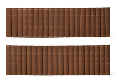 London: Printed and Published by and for Joyce Gold, 1799-1818. In 40 volumes. 8vo. Profusely illustrated with engraved and etched plates, including maps, plans, portraits, etc. Brown buckram, stamped in gilt; all edges trimmed; foxing and offsetting to text and plates.
