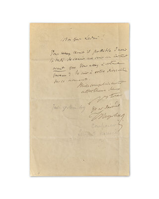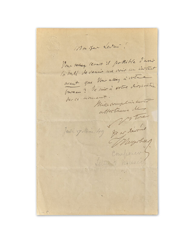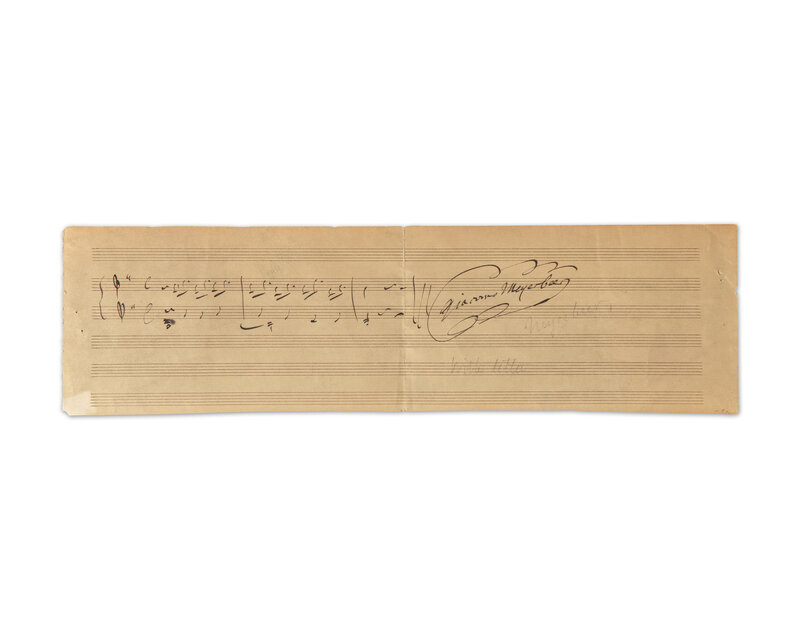 No place, no date. Single oblong sheet, 4 x 14 1/2 in. (101 x 368 mm). Autograph music quotation, boldly signed by composer Giacomo Meyerbeer. Crease from old fold; lightly toned; pin holes in left and right margins. Includes a one-page autograph letter in French, signed by Meyerbeer to an unknown recipient, requesting a meeting at his office, dated May 17, 1849. Old pencil notations on rectos of both pieces.
